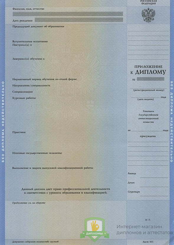 Изготовленный документ в компании «ОК-Дипломы» оформлен согласно действующим в Российской Федерации законам, соответствует нормам и особенностями, присущим тому или иному учебному заведению, имеет все элементы защиты.